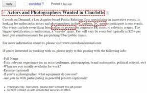 The ad was published by a firm called “Crowds on Demand” and offered $25 per hour to “actors and photographers” to take part in events in the “Charlotte, NC area.” While the ad didn’t really describe a role to be filled by its crowd of “actors and photographers” it did ask candidates to say on whether they were “ok with participating in peaceful protests.”